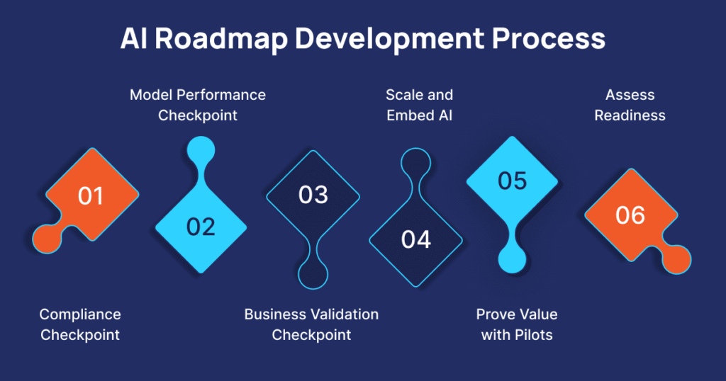 At each stage, the roadmap should include checkpoints for business validation, model performance, and compliance.