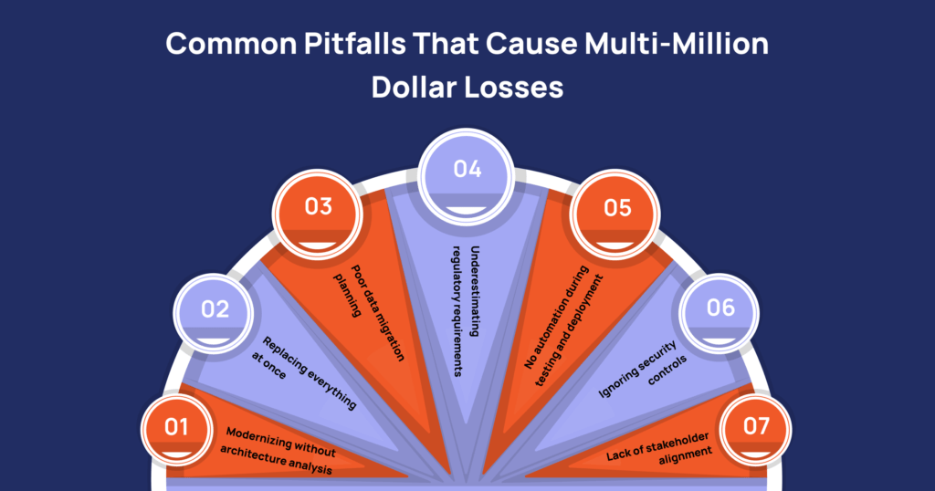 What are the common pitfalls banks face that lead to millions in losses during modernization?