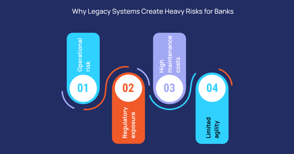 - Regulatory exposure: Regulatory compliance in banking has become stricter than ever. Legacy systems make it difficult to meet real time reporting, audit trails and data security requirements.